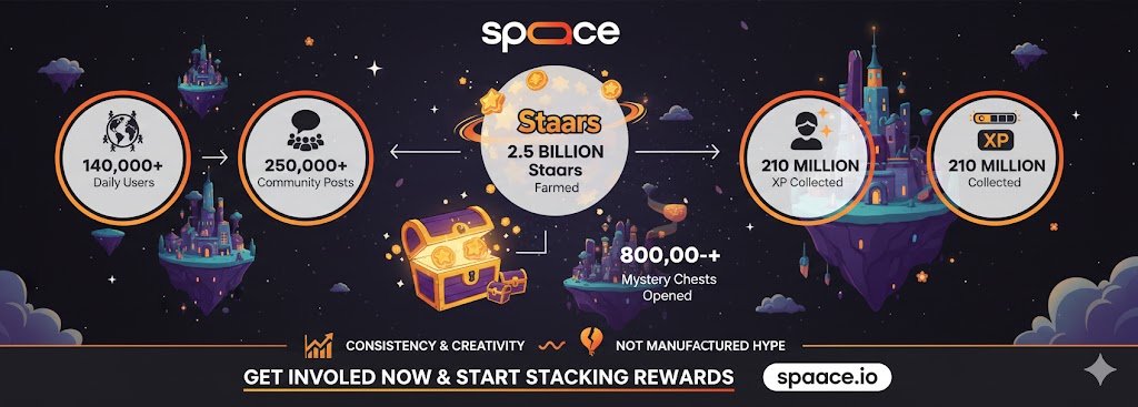 Good Morning 🌞🌞🌞 @spaace_io has grown into a living community with 140,000 plus daily users, 250,000 plus community posts, 2.5 billion Staars farmed, 800,000 plus mystery chests opened, and 210 million XP collected through pure grind those numbers show consistency and creativity not manufactured hype get involved now and start stacking rewards. join now and get 3x xp for the next 7 days - https://spaace.io/?invite=WtpjY5