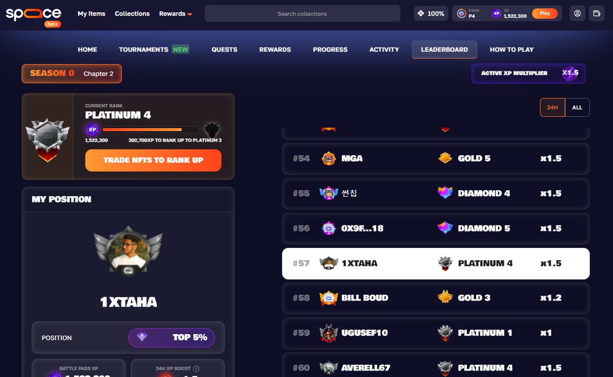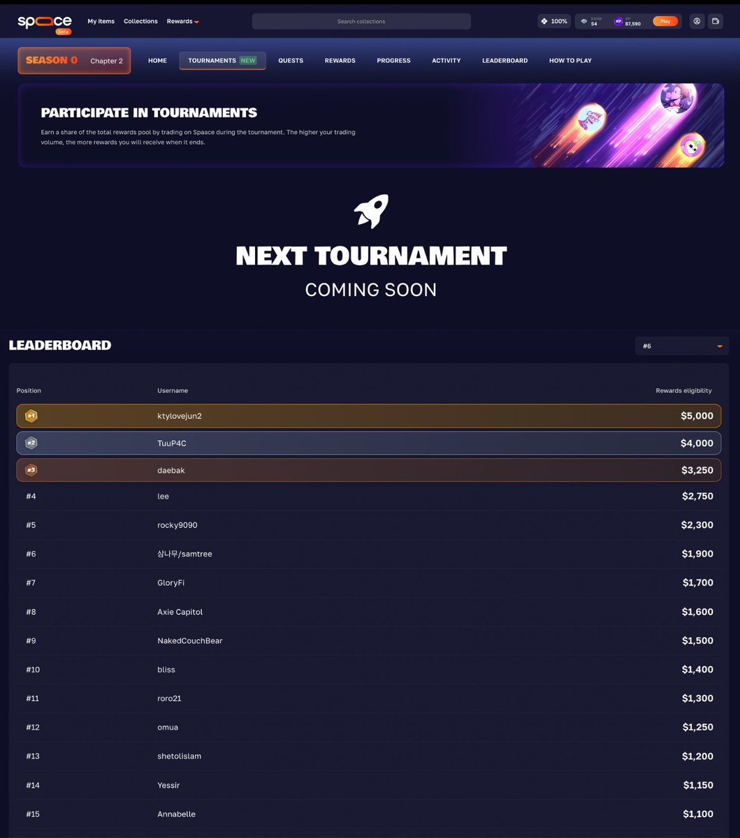 Good morning 🌞🌞🌞 Tournament #6 on @spaace_io has officially ended And now there is a break before the start of the new tournament Also volume is very low these days Tournament maybe paused But battle pass xp is still on Buy sell bid on nfts and get xps Which on tge turn into $Spaace